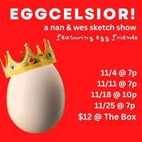 Nan and Wes have combined forces to present EGGCELSIOR!, a sketch show that probably shouldn't exist. EGGCELSIOR! serves to expand the mind of the audience by tackling modern issues such as dinosaurs, haunted cabins, the 1800s, and office bathroom politics. Nan and Wes are supported in writing and acting by their egg friends: Elena Warden, Fill Jeantete, Kevin Bransford, Kelly Shafer, Leslie Nesbit, Sam Quinn, Babaak Parcham, and Danielle Robertson.