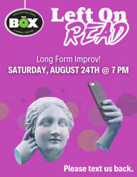 Get ready to have Left On Read (formerly known as Tasteful Nudes) take you on a hilarious (and probably strange) long-form improv adventure. This lively troupe of performers are all graduates of The Box’s improv program, with some members having also trained at other top institutions such as The Groundlings.