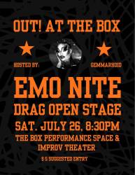 Tell all your friends! Out! At The Box, ABQ’s newest open stage drag show, is back Saturday, July 26 @ 8:30pm! This month, we’re paying tribute to emo music and culture. Come out in your best scene look and enjoy drag inspired by our Hot Topic heroes! Sign-ups to perform are open to drag artists of any and all experience levels.